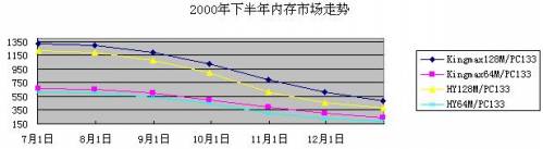 内存市场是2000年的热点,半年前曾经12XX元的128M内存条已经下跌至不到400元,内存价格巨幅下跌在市场掀起狂热装机潮的同时,也使装机标配从64M过渡到128M。去年,也曾经有一个短暂的128M标配的时期,可惜随后即从600元附近被拉高到2000元的天价。